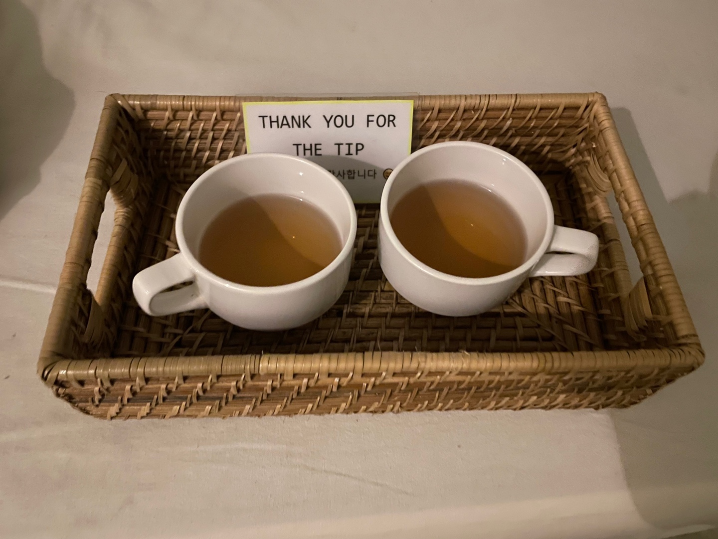 자 이제 앙케트를 제출하였고 마사지를 받을 차례이다. 마사지는 2층에서 받았는데 회전 계단이 고급스러웠다. 1층의 접수처와는 달리 2층은 조명이 어두웠고 시냇물이 흐르는 소리와 편안한 명상 음악이 틀어져 있었다. 처음에 들어간 방에서 발을 씻어준다. 나는 여전히 이런 것에 익숙하지 않아 다른 사람이 정성스레 발을 씻겨준다는 것에 대해서 좀 쑥스러웠다.